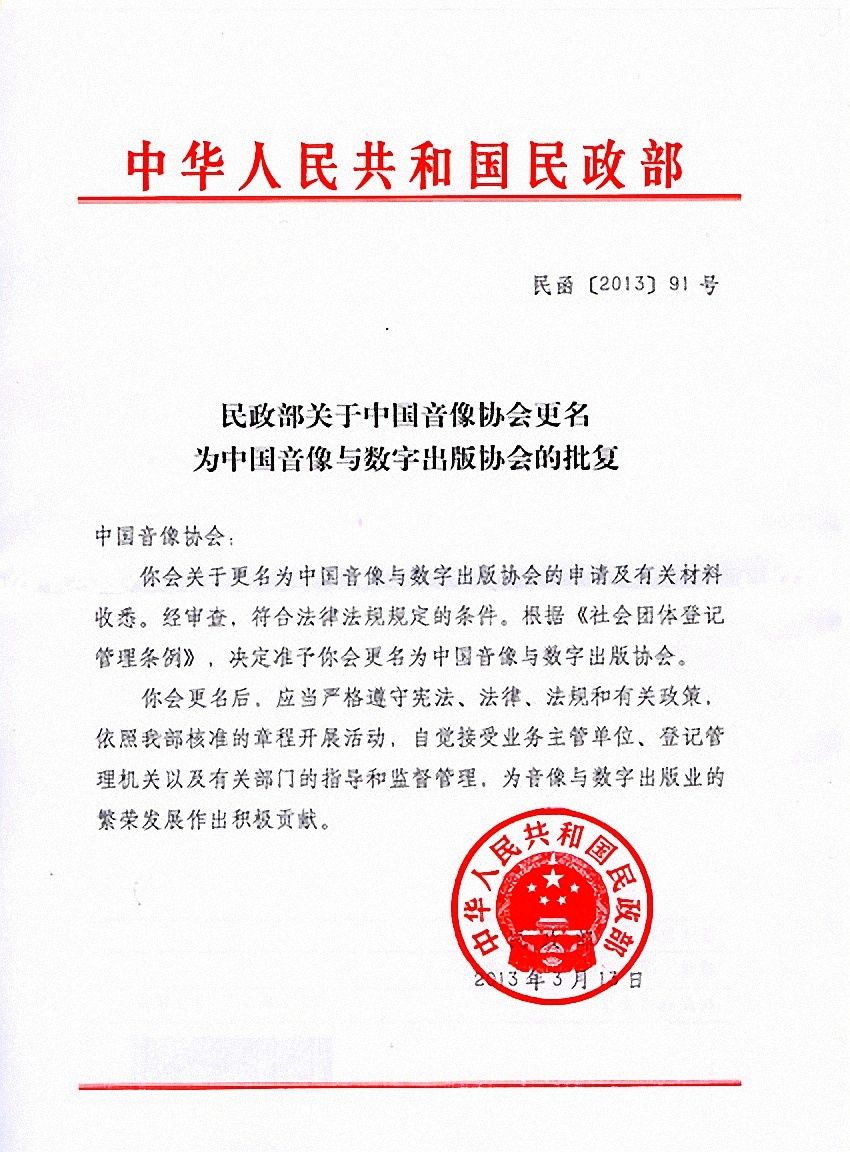 经新闻出版总署批准,民政部审核同意,中国音像协会于2013年4月份更名为中国音像与数字出版协会。更名后,原办公地址、办公电话、传真等一切联系方式不变。 特此公告