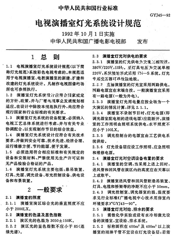 GYJ 45-1992 电视演播室灯光系统设计规范